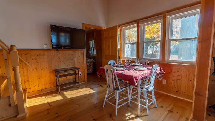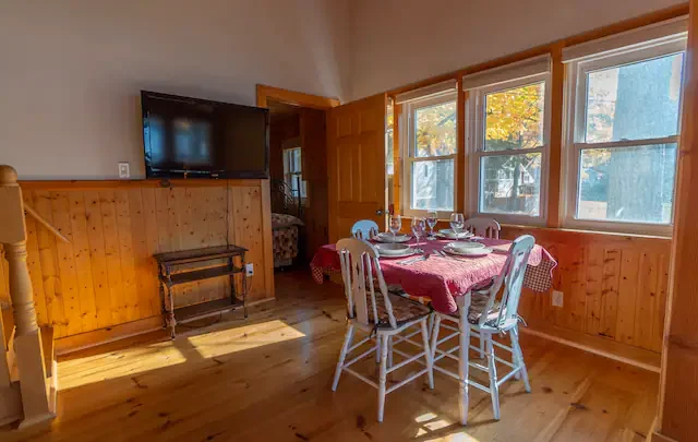 This cottage features one bedroom with a loft and a pull out couch for additional guests, bathroom, kitchen and dinning room.