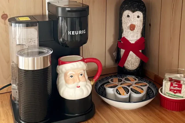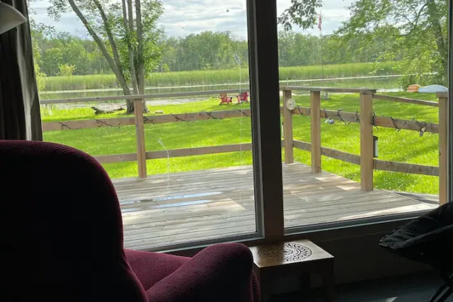 Relax in the themed living room (6.10ft ceiling) complete with a couch, rocking chair and soft foldable chair. It features a large window overlooking the backyard and river – a perfect spot for birdwatching. Wildlife is plentiful, including great blue herons, beavers, river otter, turtles, rabbits and woodpeckers.