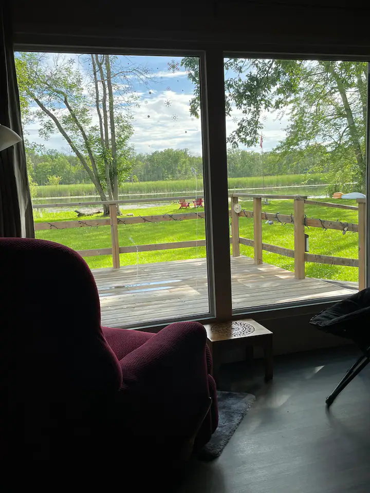 The outdoor space is a large 1/3 acre private fenced backyard. It contains a deck overlooking the Trent River, BBQ, and firepit. Firewood provided. Let us know when starting a fire as we must activate our burn permit with the Trent Hills Fire Department and ensure there is no burn ban.